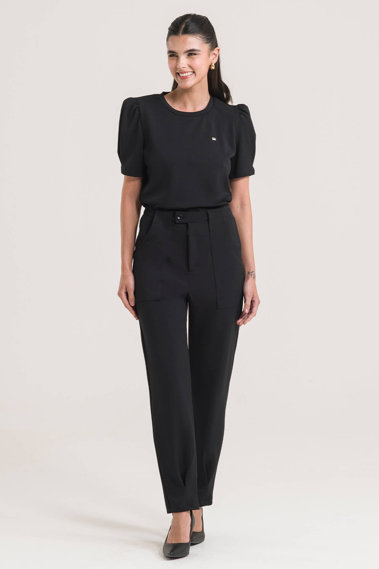 Sua calça conta com modelagem acinturada, fechamento por zíper e botão, além de bolsos frontais funcionais e pregas na barra – proporcionando um leve ajuste e um caimento moderno ao look. Já a blusa, apresenta modelagem estilo T-Shirt com mangas levemente bufantes e pregas que adicionam delicadeza e personalidade para a peça.